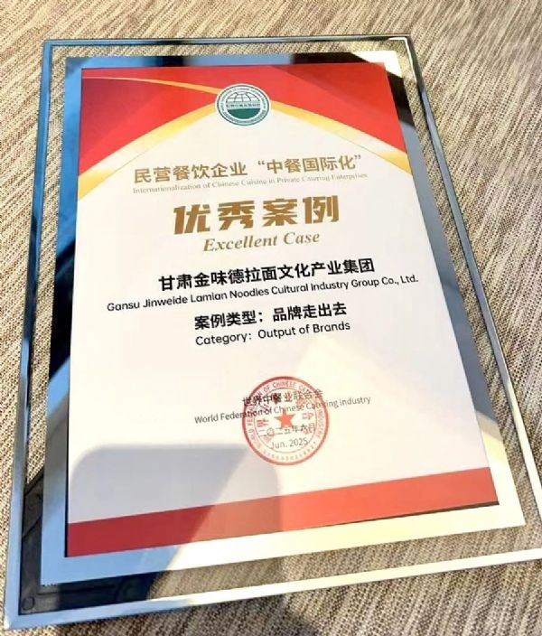 活動現場,“中餐國際化優秀案例” 正式揭曉,甘肅金味德拉面文化產業集團憑借蘭州牛肉拉面國際化的標桿實踐榮耀上榜,成為中式快餐品牌引領“中餐出海”的標桿,為中華飲食文化走向世界注入強勁動力。